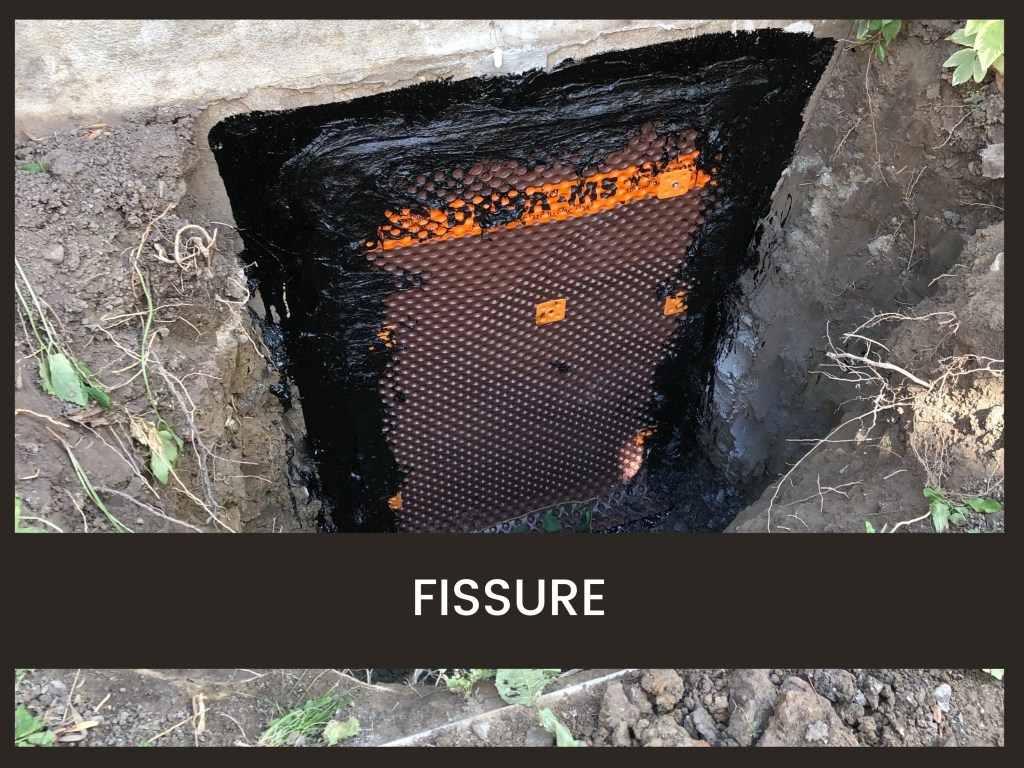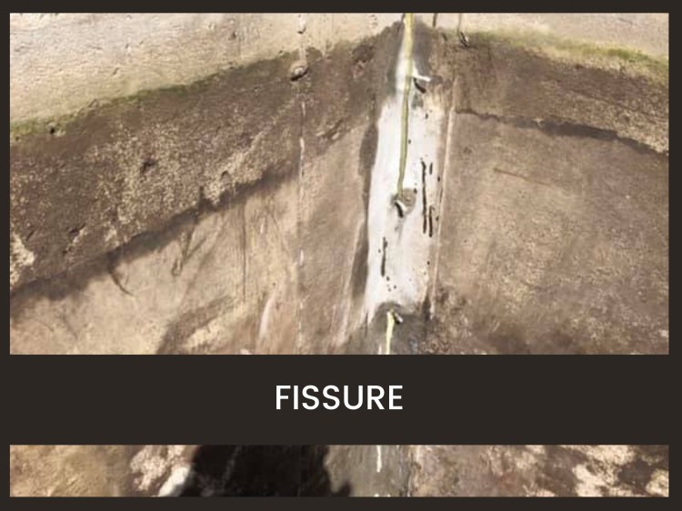 L’exécution de réparation de fissures peut se faire par l’intérieur ou l’extérieur. Du polyuréthane est injecté dans les fissures et le tout est fixé avec des plaques d’acier. Dans les cas de réparations extérieures, la section traitée est ensuite recouverte de membrane.